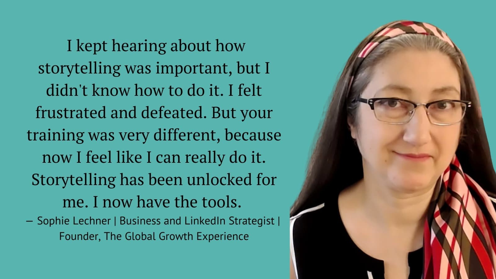 “I kept hearing about how storytelling was important, but I didn't know how to do it. I felt frustrated and defeated. But your training was very different, because now I feel like I can really do it. Storytelling has been unlocked for me. I now have the tools."
